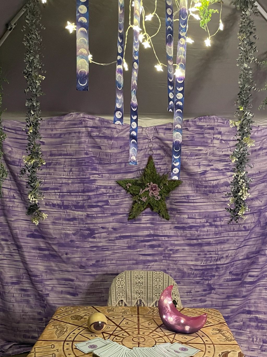 For event bookings, I offer a 3-hour Tarot reading experience under a beautifully decorated 10x10 themed tent. The setup will reflect your chosen style and provide a welcoming space for meaningful, intuitive readings.